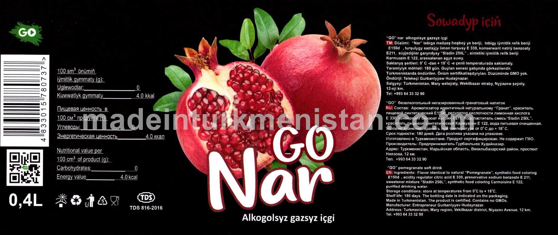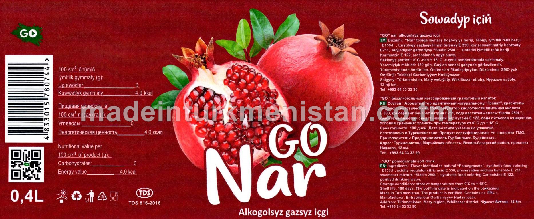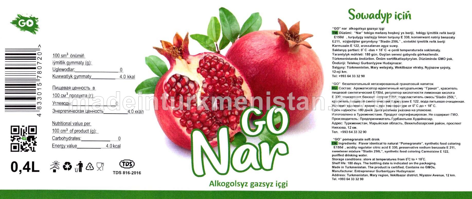 "GO" Nar alkogolsyz gazsyz içgi (gyzyl dizaýn)
