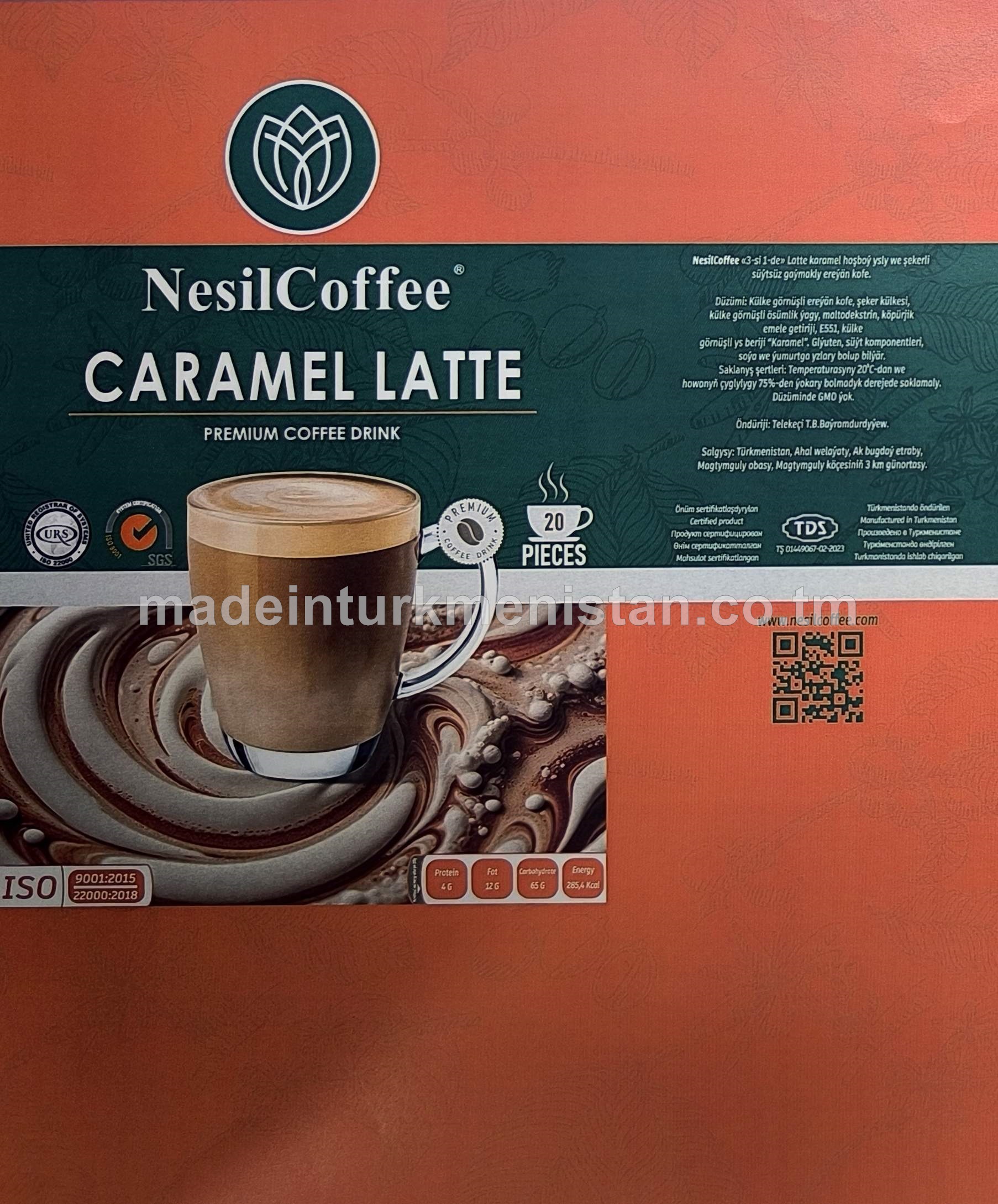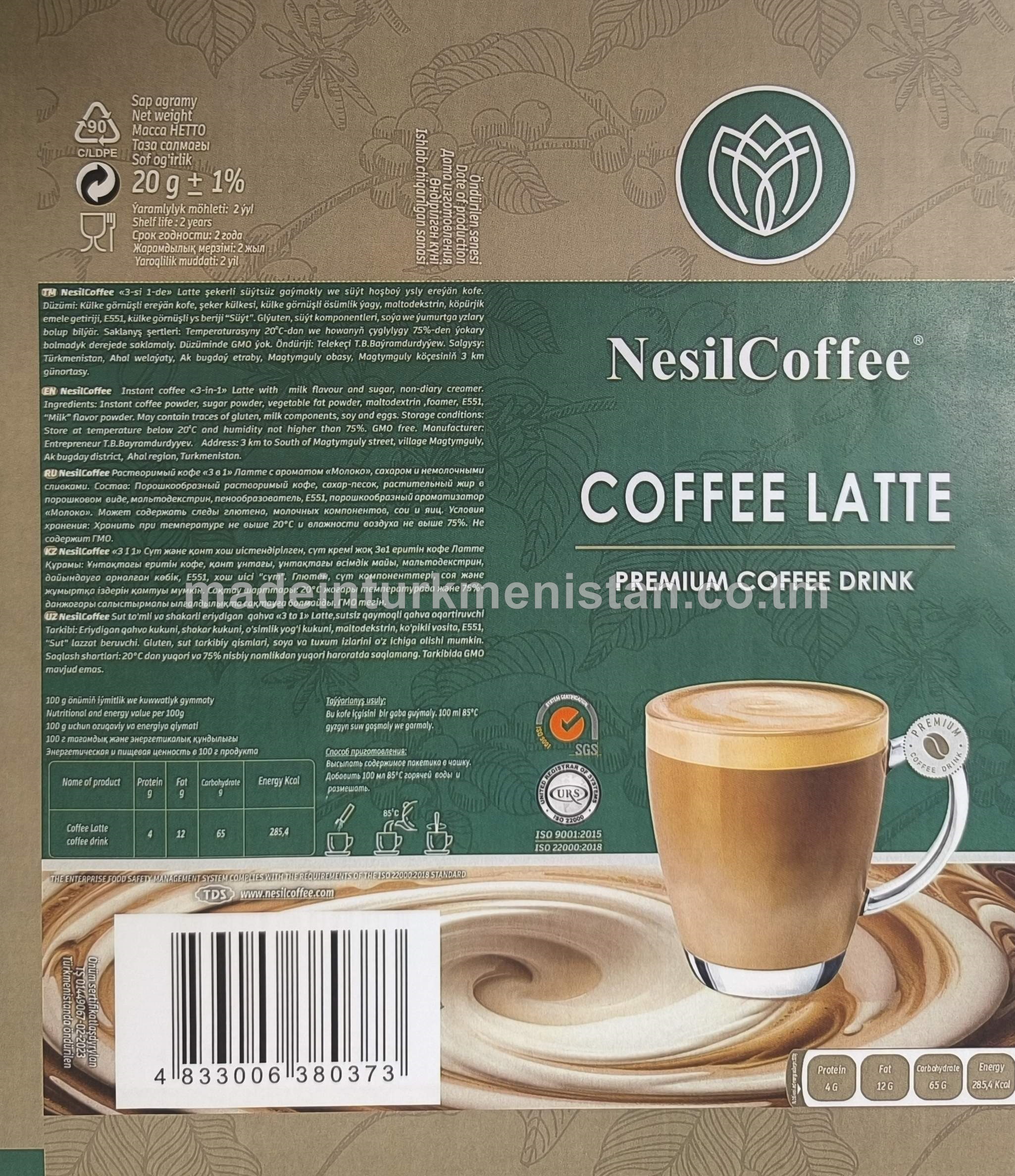 NesilCoffee "3-si 1-de" Latte karamel hoşboý ysly we şekerli süýtsüz gaýmakly ereýän kofe (20 sany x 20g)