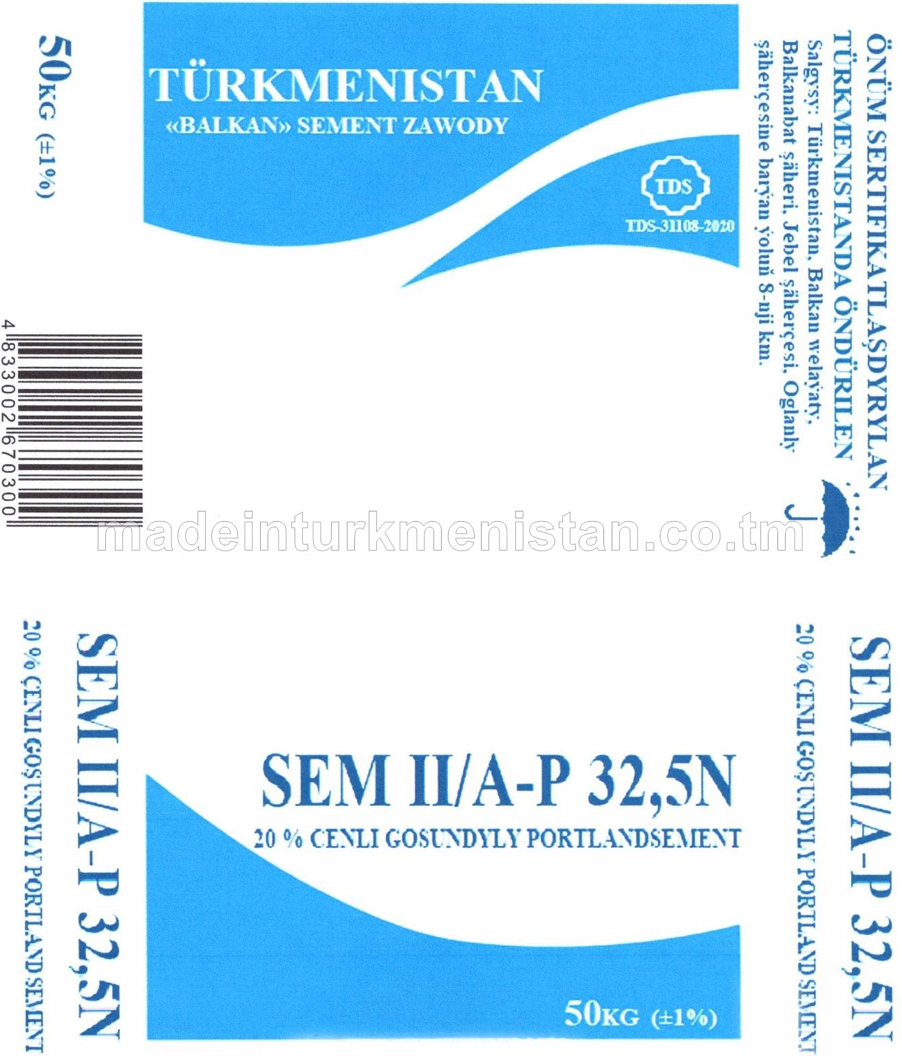20% çenli Goşundyly Portlandsement SEM II/A-P 32,5N (ЦЕМ II/А-П 32,5Н)